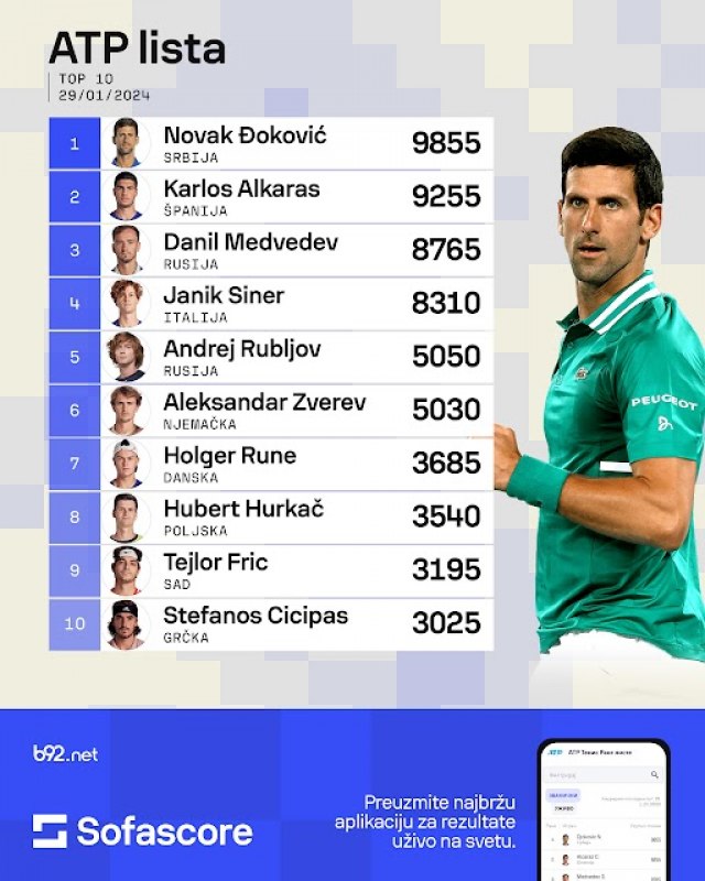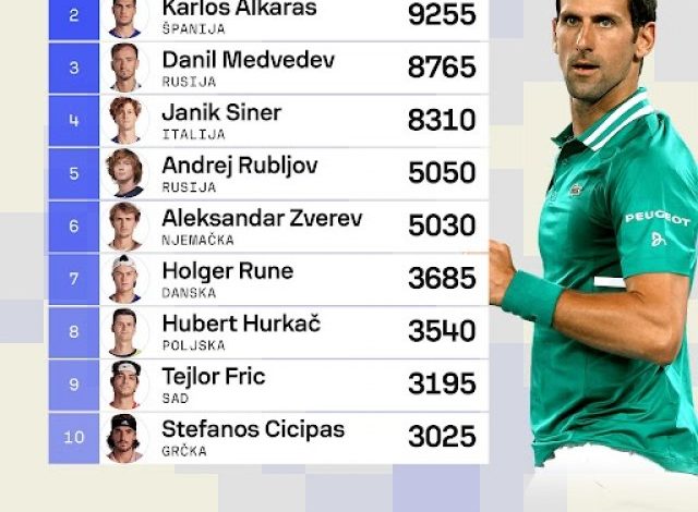 Drugi je Alkaraz sa 9.255 bodova, slijedi finalista Melburna Danil Medvedev, dok je šampion prvog grend slema u sezoni Janik Siner četvrti na svijetu sa 8.310 bodova.