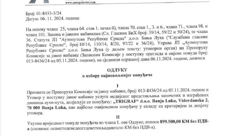„Autoputevi RS“ su dodijelili malo poznatoj firmi „Trigraf“ iz Banjaluke posao medijskog predstavljanja onoga što je jedini posao ovog javnog preduzeća, tačnije promocije započetih i izgrađenih dionica auto-puta vrijedan više od million KM.