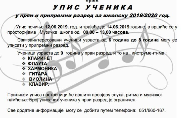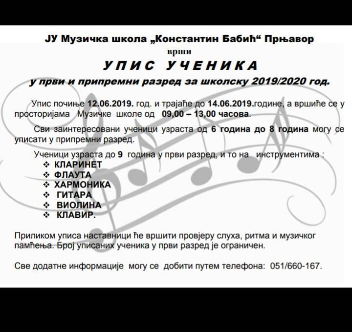 JU Muzička škola “Konstantin Babić” vrši upis učenika