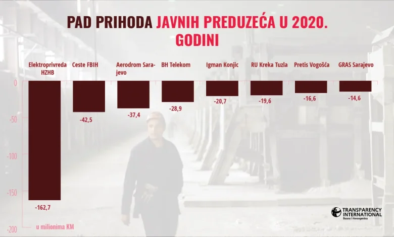 Tokom prošle godine prihodi 50 najvećih i najznačajnijih javnih preduzeća u BiH pali su za oko 430 miliona KM, a više od polovine njih nastavilo je da povećava troškove plata i gomila gubitke, koji su u prosjeku veći za 55%. To pokazuju podaci o poslovanju koje je Transprency International u Bosni i Hercegovini (TI BiH) objavio na online platformi transparentno.ba gdje su prikupljeni finansijski i revizorski izvještaji, podaci o platama i naknadama direktora i članova uprave, troškovi reprezentacije i drugi podaci iz poslovanja preko 300 javnih preduzeća.