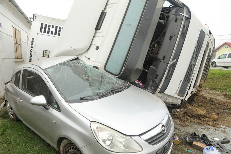 – Vozač šlepera ulaskom u zavoj nije prilagodio brzinu kretanja, te je zahvatio bankinu, udarivši u metalnu zaštitu ogradu i saobraćajni znak, pri čemu se šleper prevrnuo na bok. Pritom je udario u dva osobna parkirana automobila, a poluprikolica udarila u ugao kuće, zbog čega je došlo do oštećenja inventara u frizerskom salonu – rekli su iz PU osječko-baranjske.