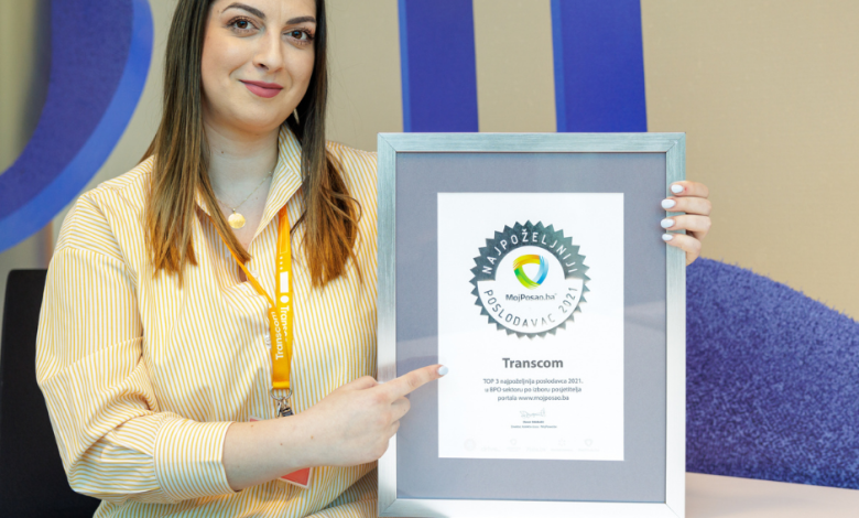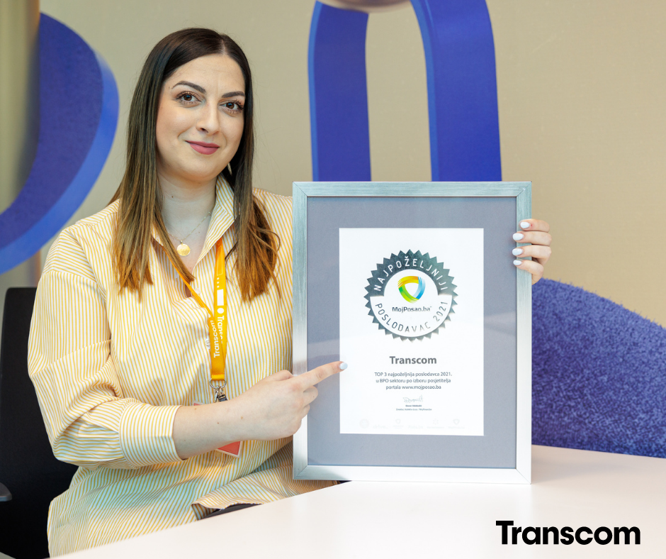 Dobar odnos poslodavca prema zaposlenicima, pozitivno radno okruženje, sigurnost zadržavanja posla, visoki kvalitet proizvoda ili usluga, mogućnost povećanja plate. Ovo su samo neke od kategorija na temelju kojih je portal MojPosao.ba u 2021. godini upravo Transcomu dodijelio nagradu za jednog od top tri poslodavca u sektoru. 300 zaposlenih u kompaniji u BiH, odnosno 30000 zaposlenih u cijelom svijetu svakodnevno govore u prilog ovome, njegujući vrijednosti i visoke standarde poslovanja koje Transcom pruža. Kompanija je ovom nagradom nastavila graditi niz javnih priznanja u svom poslovanju, budući da je u 2021. godini već nagrađena za jednog od najznačajnijih investitora u Bosni i Hercegovini.