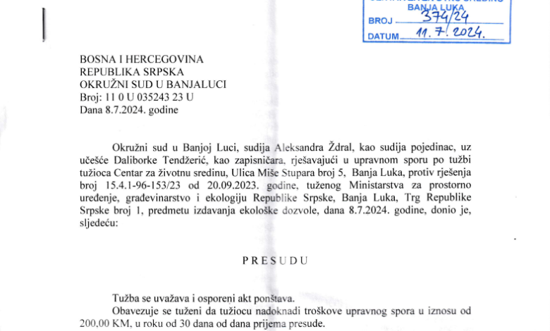 “Tuženi je trebao ostati kod zaključka kojim je prekinut postupak za izdavanje ekološke dozvole, do njegovog okončanja”, navodi se u presudi.