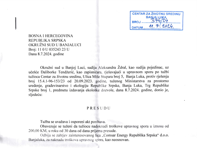 Sud je presudu donio u upravnom sporu koji je Centar pokrenuo u oktobru 2023. godine, i to nakon što je resorno ministarstvo koje vodi Bojan Vipotnik, uprkos tome što je zvanično prekinulo postupak odlučivanja o izdavanju ekološke dozvole, na zahtjev investitora ponovo odlučilo da izda ovu dozvolu za planirani projekat.
