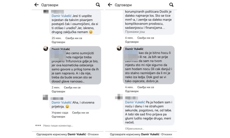 – Da sam na tvom mjestu, ja bih se prije zabrinuo da hodam noću (ili čak danju) i što stalno razmišljam da li mi je neko iza leđa. Dokle god se vi tako osjećate, dobro je – rekao je Damir Vukelić, nakon čega je izbrisao ovaj komentar.