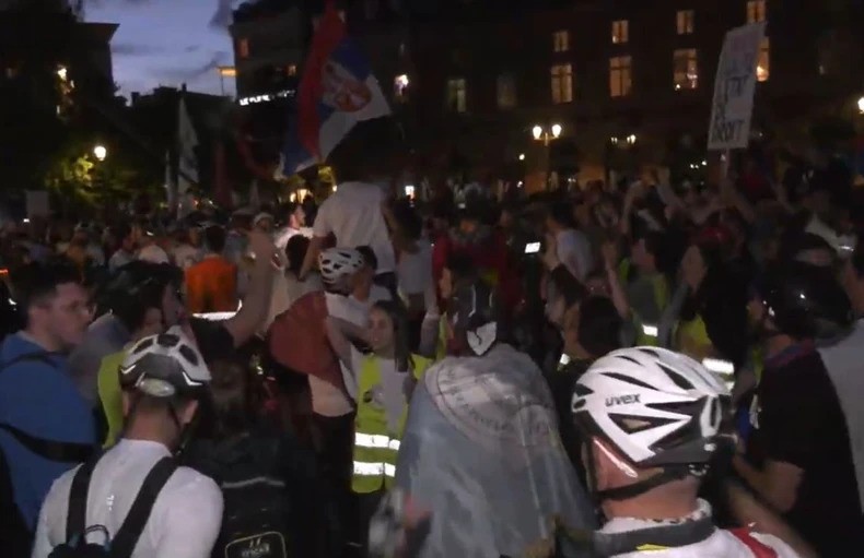 Dolazak studenata biciklista u Strazbur beogradski i novosadski studenti pratili su večeras okupljeni ispred RTS-a i RTV-a.