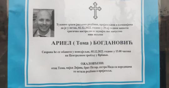 Ariel Bogdanović (28), koji je u petak izboden u Banjoj Luci, biće sahranjen sutra. Sahrana će se obaviti u Banjoj Luci, na Centralnom groblju u Vrbanji, u 15 sati.