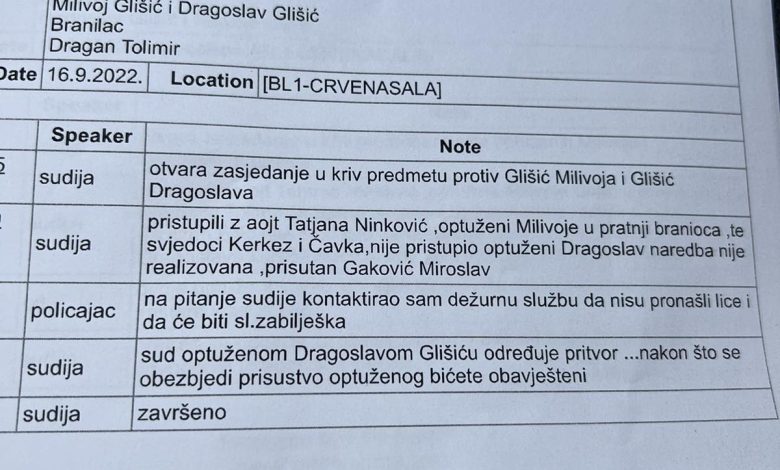 – Dakle, prijetnjom da će neposredno upotrijebiti silu, optuženi su spriječili službeno lice u institucijama Republike Srpske u vršenju službene radnje koju je preduzelo u okviru svojih ovlašćenja i ugrozili su sigurnost lica prijetnjom da će njega ili blisko lice lišiti života. Čime je osumnjičeni Milivoje Glišić učinio krivično djelo sprečavanje službenog lica u vršenju službene radnje, a osumnjičeni Dragoslav Glišić krivično djelo sprečavanje službenog lica u vršenju službene radnje u sticaju sa krivičnim djelom ugrožavanje sigurnosti – navodi se u optužnici.